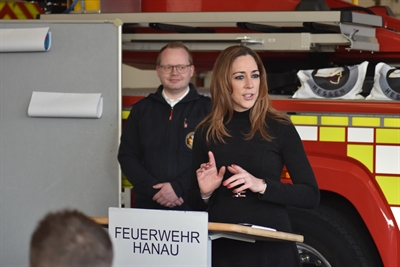 Die Preisverleihung wurde von Stadträtin und Feuerwehrdezernentin Isabelle Hemsley vorgenommen, die den drei Gewinnerklassen persönlich gratulierte. Begleitet wurde sie vom stellvertretenden Amtsleiter Sean Heesch sowie dem Vorsitzenden des Feuerwehr-Stadtverbandes Wolfgang Müller. In ihrer Ansprache würdigte Isabelle Hemsley das Engagement der Schülerinnen und Schüler sowie die Vielfalt der eingereichten Werke: „Eine Auswahl fiel der Jury aufgrund der Vielzahl an großartigen Kunstwerken sehr schwer. Die Bilder zeigen eindrucksvoll, wie unsere Hanauer Kinder die Arbeit der Feuerwehr wahrnehmen. Mutig, hilfsbereit und unverzichtbar für unsere Stadt.“