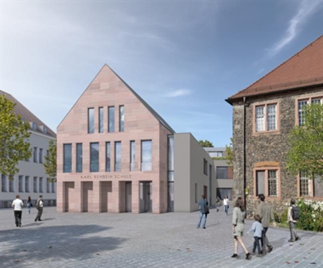 Nach dem Abriss des “Haus des Handwerks” kommt der Neubau für die Erweiterung der Karl-Rehbein-Schule: Mit seiner Sandsteinfassade fügt sich der Erweiterungsbau künftig nahtlos in das historische Umfeld des Schlossplatzes ein.