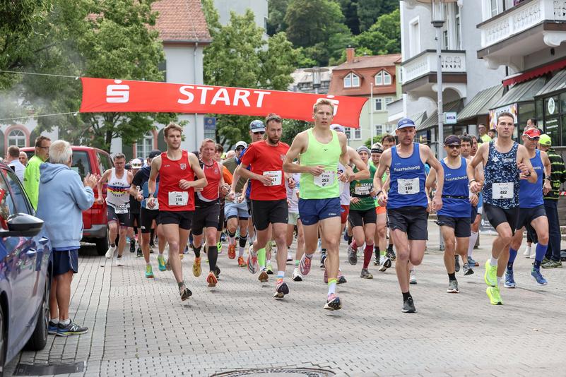 Bildunterschrift: Der Brüder-Grimm-Lauf wirft seine Schatten voraus: Ab dem 11. November kann man sich für die 40. Auflage anmelden. Das Foto zeigt den Etappen-Start in Bad Orb beim Brüder-Grimm-Lauf 2025.