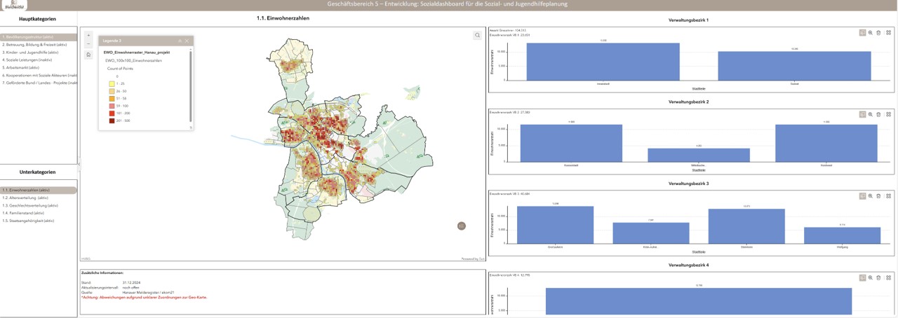 Sozial-Dashboard: Dieses digitale und interaktive Berichtssystem basiert auf einem Geoinformationssystem (GIS), das in Hanau bereits vielfältig genutzt wird. Das Besondere: Daten werden kleinräumig – also nach Stadtteilen, Ortsbezirken und Kleinstbezirken – ausgewertet und miteinander verknüpft. So kann zum Beispiel dargestellt werden, wie viele Menschen einer bestimmten Altersgruppe in einem Stadtteil leben und wie viele davon arbeitssuchend sind. Auf diese Weise lassen sich Probleme frühzeitig erkennen und Maßnahmen gezielt dort einsetzen, wo sie gebraucht werden.
