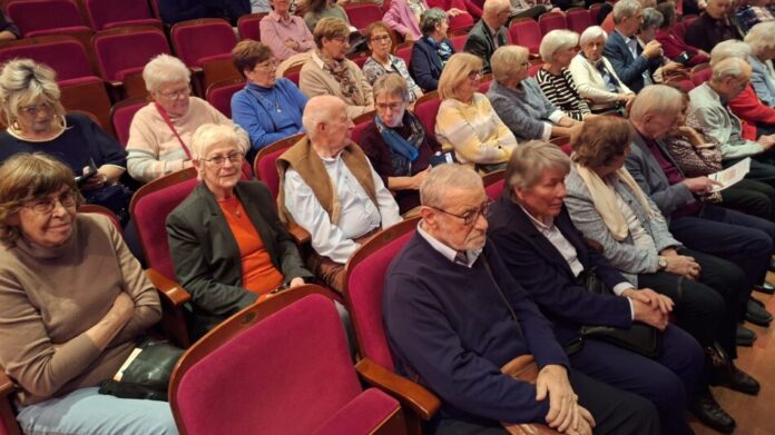 Die Rodenbacher und Ronneburger Besucher*innen warten in den ersten drei Reihen gespannt auf das Theaterstück „Außer Kontrolle“ in der Komödie in Frankfurt.