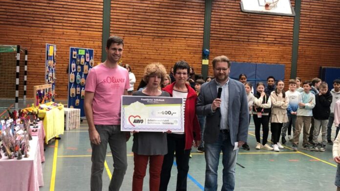 Helga Schlörb, die Vorsitzende vom Ortsverein Schöneck-Nidderau der Arbeiterwohlfahrt (AWO) und ihre Stellvertreterin Sabine Forchel haben an den Schulleiter Björn Baer und der 2. Vorsitzende des Fördervereins Sterntaler Schule e.V., Julian Nattler, einen Scheck über 400,00 € übergeben. Dabei handelt es sich um den Erlös aus dem Kinderflohmarkt im November vergangenen Jahres. Die Eltern und Lehrer haben beim Verkauf von Kaffee und Kuchen beim Kinderflohmarkt mitgewirkt. Das Geld soll für regelmäßige kulturelle Bildung an außerschulischen Lernorten verwendet werden.