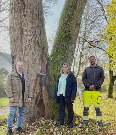 Sebastian Alexander (Leiter Bauhof), Bürgermeisterin Carina Wacker und Baumkontrolleur Thomas Zirngibl am Silberahorn in der Wachenbucher Straße in Kilianstädten.
