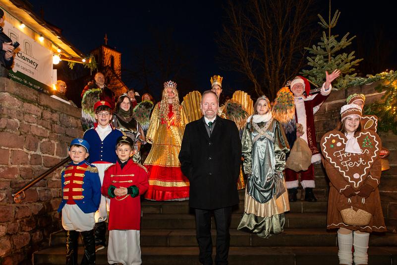 Bürgermeister Eröffnung: Bürgermeister Christian Litzinger mit Christkind, Weihnachtsmann, Engeln und weiteren Weihnachtsfiguren.