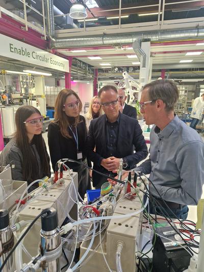 Im Rahmen des Besuchs besichtigten Kasseckert und Hemsley unter anderem das Labor für elektrochemische Prozesse. Mit Hilfe der Elektrochemie kann eine deutliche Reduktion von Rohstoffen ermöglicht werden, was einen wichtigen Beitrag zur Senkung von Produktionskosten und CO₂-Emissionen bedeutet. Auch die Batterieforschung spielt am Standort eine zunehmend wichtige Rolle.