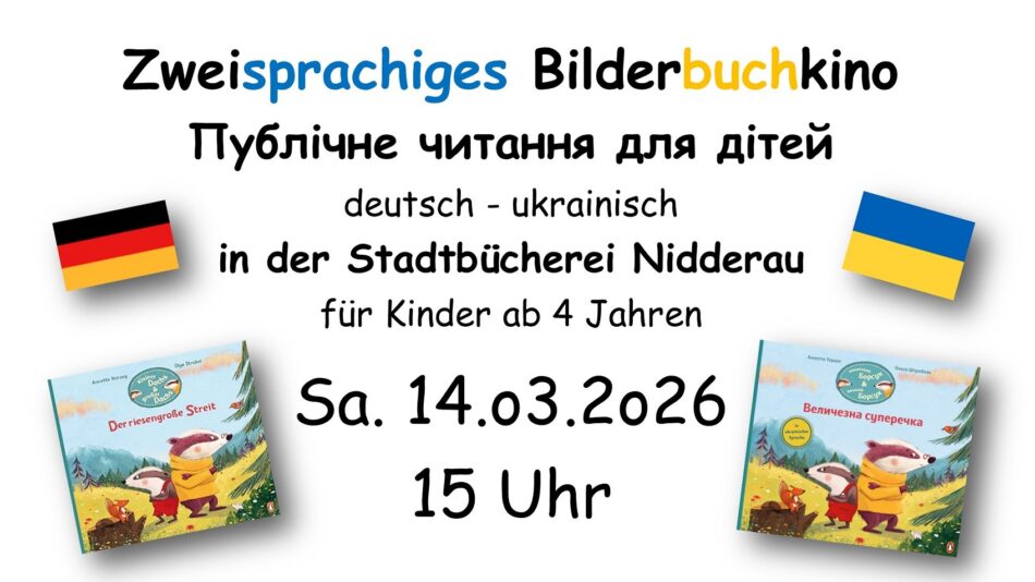Ein besonderes Highlight veranstaltet der Förderverein der Stadtbücherei Nidderau e.V. am Samstag, den 14. März um 15 Uhr in der Stadtbücherei mit einem zweisprachigen Bilderbuchkino auf Deutsch und Ukrainisch. Dieses findet in Kooperation mit der Flüchtlingshilfe Nidderau statt, die in diesem Jahr ihr 10-jähriges Bestehen feiert.