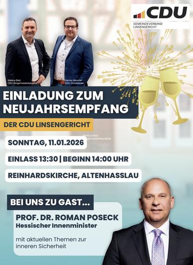 Linsengericht (br). Die CDU Linsengericht und ihr Bürgermeisterkandidat Markus Betz laden am Sonntag, 11. Januar 2026, zum Neujahrsempfang in die Reinhardskirche, Hauptstraße 30 in Altenhaßlau, ein. Der Einlass beginnt um 13:30 Uhr, der offizielle Teil startet um 14:00 Uhr.