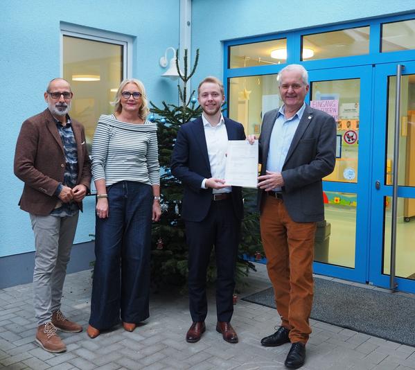 Bildunterschrift: Kreisbeigeordneter Jannik Marquart (Zweiter von rechts) übergibt Wächtersbachs Bürgermeister Andreas Weiher (rechts) den Förderbescheid für den neuen Kita-Anbau und mit den beiden freuen sich Kita-Leiterin Michaela Krone-Samer, sowie Martin Horst, Leiter des Personalamts der Stadt Wächtersbach.
