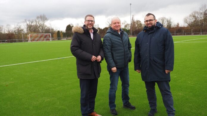 Zu einem Informationsbesuch hat sich Landrat Thorsten Stolz kürzlich mit Vorstandsmitglied Joachim Lucas und Freigerichts Bürgermeister Waldemar Gogel getroffen. Noch sind die Arbeiten an der Außenanlage nicht vollständig abgeschlossen. Zudem fehlen die neuen Fußballtore. Diese werden Rollen haben, damit der Kunstrasen nicht beschädigt wird, wenn die Tore bewegt werden müssen.