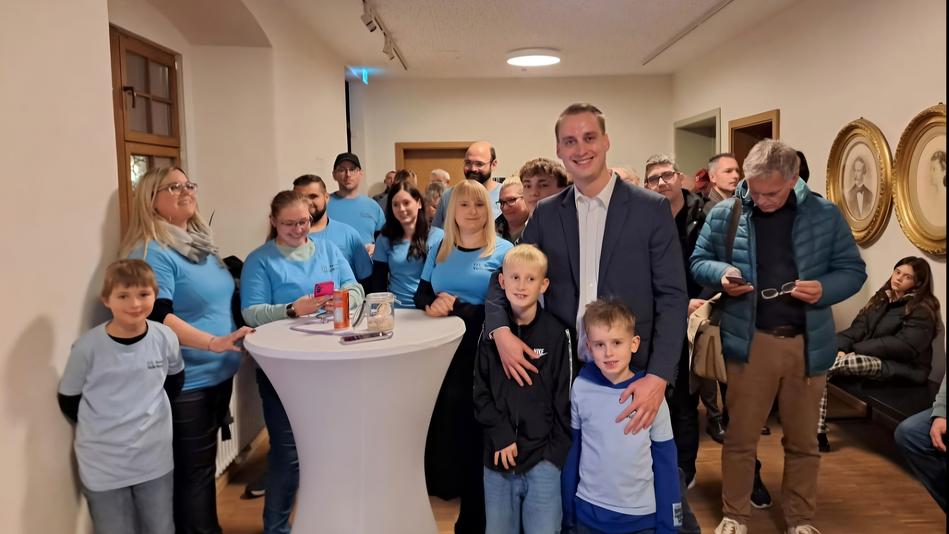 Bürgermeisterkandidat Jan Volkmann am Wahlabend mit Team und Familie im Wächtersbacher Rathaus