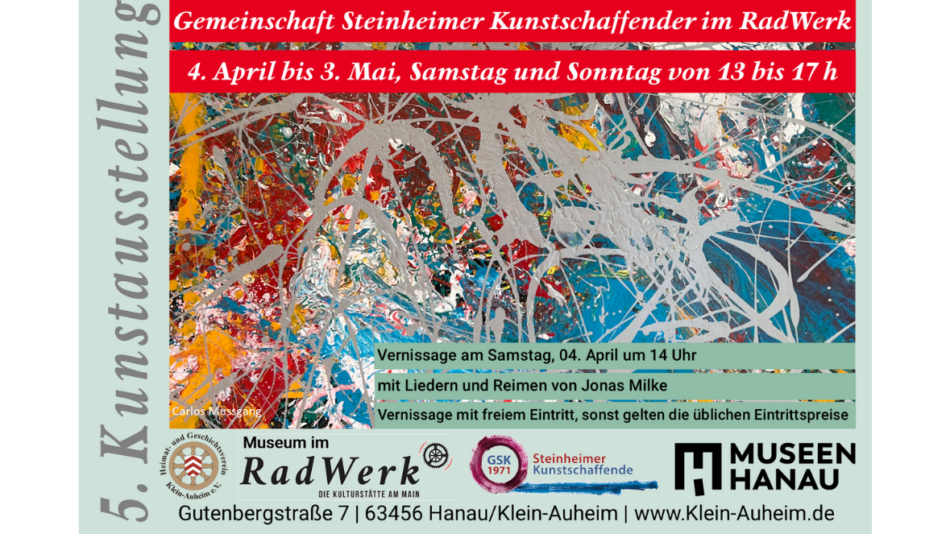 Klein-Auheim. Die Gemeinschaft Steinheimer Kunstschaffender stellt vom 4. April bis zum 3. Mai im Museum im RadWerk aus. Ein Querschnitt der Arbeiten vieler GSK-Mitglieder und Gästen wird im Sonderausstellungsraum, aber auch innerhalb der Museumsräume an den Wochenenden von 13 bis 17 Uhr zu sehen sein.