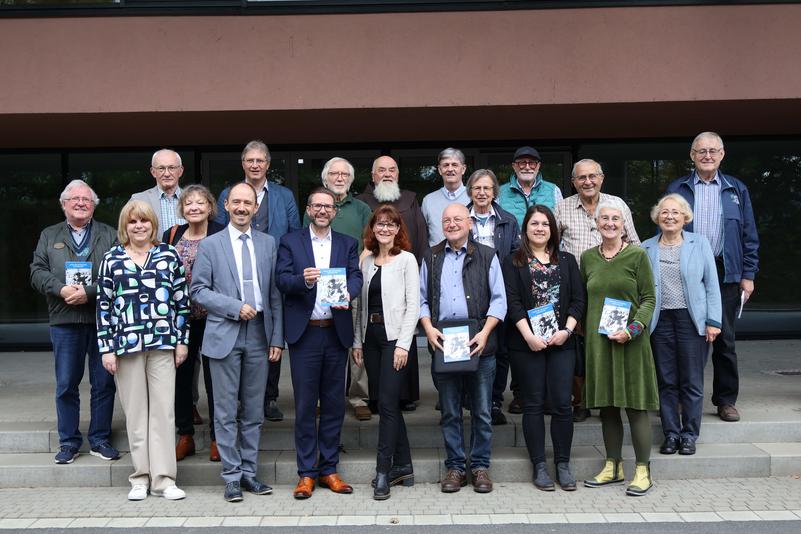 Bildunterschrift: Das Gelnhäuser Heimatjahrbuch 2026 ist da: Es befasst sich schwerpunktmäßig mit dem Ende des Zweiten Weltkriegs vor 80 Jahren. Unser Bild zeigt einige der Autorinnen und Autoren zusammen mit Landrat Thorsten Stolz (vordere Reihe, Dritter von links), Oliver Naumann (Verleger des Druck- und Pressehauses Naumann) vordere Reihe, Zweiter von links) und Christine Raedler (Leiterin des Zentrums für Regionalgeschichte, vordere Reihe, Vierte von links).