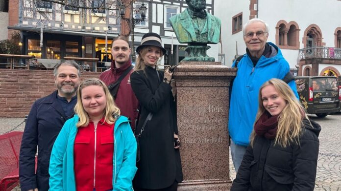 Die Gastgeber einer internationalen Lesung am vergangenen Wochenende in Gelnhausen, Daniel Glöckner und Peter Völker, hatten den jungen Schriftstellerinnen und Schriftstellern aus Österreich, Bosnien und Herzegowina und Serbien ein dreitägiges Rahmenprogramm zum Veranstaltungsort Gelnhausen organisiert. Während einer von Glöckner angebotenen Stadtführung nahmen sie unter anderem den Erfinder des Telefons, Philipp Reis, in ihre Mitte. Selbstverständlich war in das Programm auch ein Besuch der Kaiserpfalz vorgesehen. Am Schillerdenkmal im Wald oberhalb der gedachten sie des großen deutschen Dichters, Friedrich Schiller, und lasen gemeinsam seine „Ode an die Freude“ in der Ursprungsfassung, die Völker als Gründungsmitglied des Schillervereins Leipzig zur Verfügung gestellt hatte.