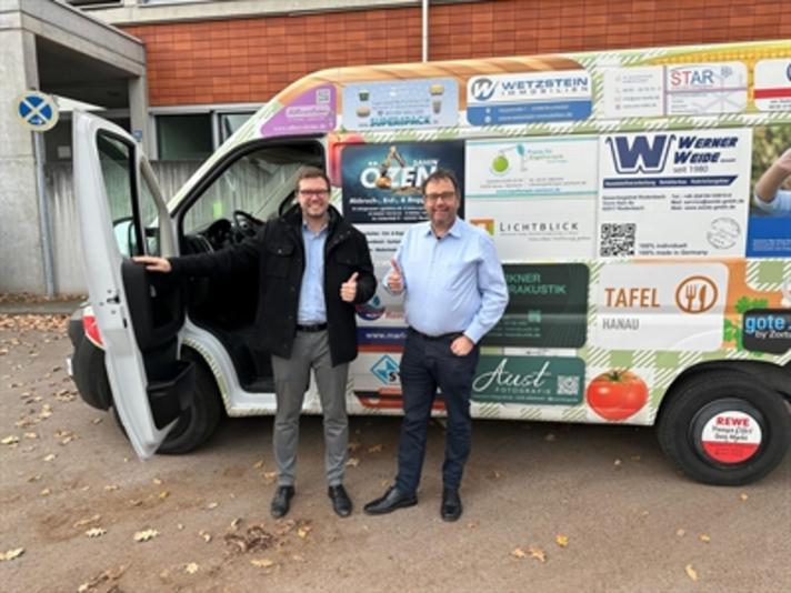 Daumen hoch: Hanaus Bürgermeister Dr. Maximilian Bieri und Jörg Mair, Geschäftsführer der Lichtblick-Stiftung der Evangelischen Marienkirchengemeinde Hanau, freuen sich, dass der Kühlwagen der Hanauer Tafel repariert und wieder im Einsatz ist.