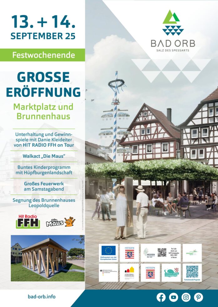 Bad Orb, im Spessart, im August 2025. Nach umfangreichen Modernisierungsarbeiten wird der Marktplatz – das Herz der Bad Orber Innenstadt – feierlich eröffnet. Gleichzeitig wird das das Brunnenhaus der neu gefassten Leopoldquelle eingeweiht. Die Stadt Bad Orb lädt alle Bürgerinnen, Bürger und Gäste ein, dieses besondere Festwochenende gemeinsam zu feiern und die neuen Attraktionen im festlichen Rahmen kennenzulernen.