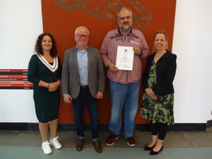Sandra Hernandez (Stadt Hanau), Frank Amhaus (Ortsvorsteher vom Ortsgericht Hanau III Wolfgang von November 2014 bis September .2025, Norbert Eyer (neuer Ortsgerichtsvorsteher vom Ortsgericht Hanau III Wolfgang) und Eva Schmidtbleicher (Richterin am Amtsgericht Hanau als ständige Vertreterin einer Direktorin).