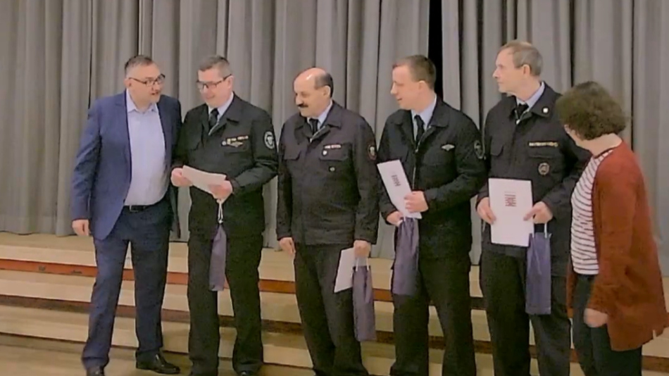 Die vier Feuerwehrleute von li.: Daniel Christ (2.von l.), Thomas Nagel (3.von li), Klaus Fischer (4.von li.) und Norbert Wetz (2.von re.) werden von Bürgermeister Klaus Büttner (li.) und Gemeindevorsteherin Kristin Schneider (re.) für ihre Ehrenamtstätigkeit ausgezeichnet.
