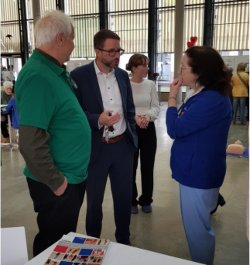 Die Herzsportgruppe Gelnhausen e.V. hat sich auch in diesem Jahr wieder mit einem Informationsstand am Tag der Herzgesundheit im Main-Kinizig-Forum Gelnhausen beteiligt. Die zahlreichen Interessenten wurden von Aktiven, Vorstandsmitgliedern, Übungsleiterinnen und einer betreuenden Ärztin über Leistungen und Aktivitäten des Rehasportvereins unterrichtet. Auch Landrat Thorsten Stolz stattete den Herzsportlern einen Besuch ab (auf dem Foto mit der betreuenden Ärztin Dr. Marie-Ev Horbach und dem 1.Vorsitzenden Klaus Schmidt).