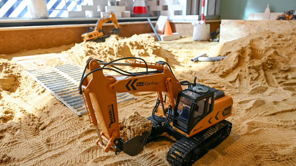 Verbaut wurden in der Baggerbude mehrere hundert Kilo an Sand. An einer rund drei Meter langen Theke können die Bagger-Begeisterten Platz nehmen und ihre Fahrzeuge durch die Sandlandschaft manövrieren.