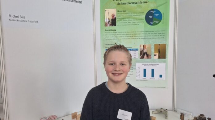 „Im Kindergarten habe ich einmal eine Schnecke angefasst und die hat furchtbar geklebt. Das ging selbst beim Händewaschen nicht ab.“, berichtet Michel Bilz aus der 6. Klasse, wenn man ihn fragt, wie er auf die Idee für sein Projekt gekommen ist. Beim Regionalwettbewerb hat er mit seinem Projekt „Kleber aus Schneckenschleim“ in der Sparte Technik den 1. Preis und die Qualifikation für den Landeswettbewerb erreicht – und das gleich bei seiner ersten Teilnahme. Übrigens haben bei der Entwicklung des Klebers keine Schnecken ihr Leben gelassen. Der echte Schneckenschleim wurde aus Kollagen, Puderzucker, Wasser und Glycerin nachgebaut. Mit Salicylsäure wurde dann noch die Haltbarkeit deutlich erhöht. Die enorme Klebkraft des Schneckenschleimklebers konnte er an seinem Stand dann eindrucksvoll vorführen. Egal ob Papier, Holz oder Plastik – bis zu 7 kg Gewicht hat sein Kleber ausgehalten.