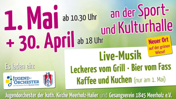 Mit einem eingespielten Team findet die diesjährige Maifeier in Meerholz an einem neuen Ort statt. Am 30. April und am 1. Mai wird auf der Grünfläche vor der Sport- und Kulturhalle gefeiert und nicht wie bisher am Angelerheim. Für die beiden Veranstalter, das Jugendorchester der katholischen Kirche Meerholz-Hailer und den Gesangverein 1845 Meerholz, eine kleine Herausforderung, hatte man sich doch gerade an das Gelände am alten Sportplatz gewöhnt und dort bisher dreimal die beliebte Feier ausgerichtet.