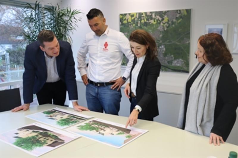 Patrick Kremer, Geschäftsführer der Kremer Pflegedienste (Zweiter von links), informierte sich gemeinsam mit Bürgermeisterin Monika Böttcher, MIG-Geschäftsführer Daniel Schächtele und Kathleen Wendler als Leiterin des Fachbereichs Soziale Dienste (rechts) im Rathaus und auf der Baustelle über die Planungen für das Wohn- und Ärztehaus mit Tagespflege sowie den Fortschritt der Abbrucharbeiten.