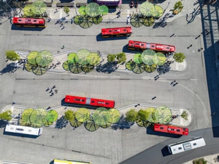 Hanau schafft auch durch den neuen Nahverkehrsplan Planungssicherheit für einen modernen Stadtverkehr. Das Luftbild zeigt den Omnibusknoten Freiheitsplatz aus der Vogelperspektive.