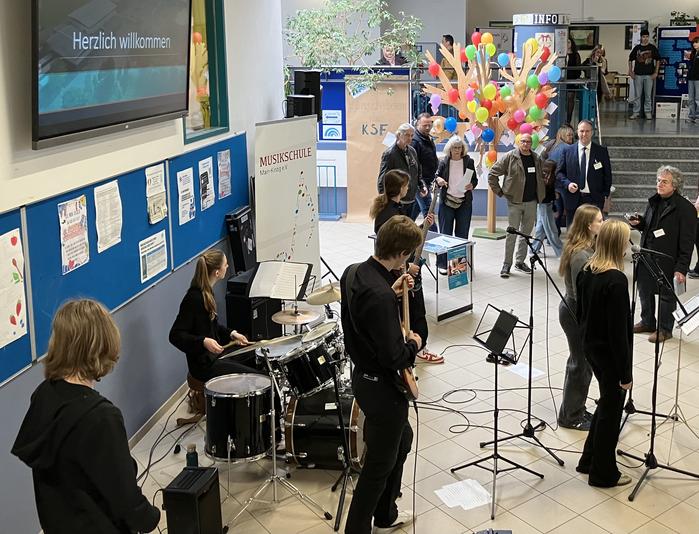 Wer Sprachen liebt, kam ebenso auf seine Kosten: Französisch, Spanisch, Italienisch, Latein und Englisch luden mit kleinen Challenges und spielerischen Formaten zum Mitmachen ein. Musik erwies sich als „kein bisschen leise“, das Theater holte die Bühne ins Klassenzimmer – und zwischendurch stärkten sich die Gäste beim Finger-Food aus der Schulküche. Im Foyer setzten die Ethik-Gruppen mit einem „Wünsch-dir-was-Baum“ ein nachhallendes Zeichen. Der Fachbereich Gesellschaftslehre lud mit Montessori-Puzzle und GEO-Memory zum Knobeln ein, die Politik- und Wirtschaftsgruppen bastelten rund um das Thema Kinderrechte, und die Geschichtswerkstatt bot sogar eine Verkleidungs-Fotobox.