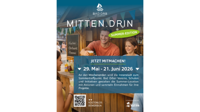 Bad Orb im Spessart, im Februar 2026. Sommerfeeling, Begegnung und Leben im Herzen der Kurstadt Bad Orb: Mit der MITTEN.DRIN Summer Edition startet die Bad Orb Kur GmbH eine neue Innenstadtaktion, die in den Wochen vor den Sommerferien für Urlaubsatmosphäre und zusätzliche Anziehungskraft im Zentrum sorgen soll – und schafft zugleich eine attraktive Bühne für Vereine, Schulen und Initiativen aus der Stadt.
