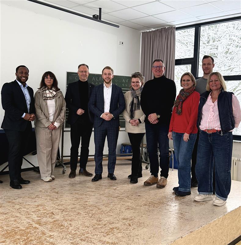 Die Delegation kam dabei mit Schulleiter Harald Schramm, seinem Schulleitungsteam sowie den Verantwortlichen der Ganztagsbetreuung intensiv ins Gespräch. Ebenfalls am Austausch beteiligt war Susanne Fries aus dem Amt für schulfachliche Aufsicht des Staatlichen Schulamts, die die Gespräche fachlich begleitete. Thematisiert wurden insbesondere die räumlichen Bedarfe der Schule, die Anforderungen des Ganztags sowie die Perspektiven für eine langfristig tragfähige Schulentwicklung.