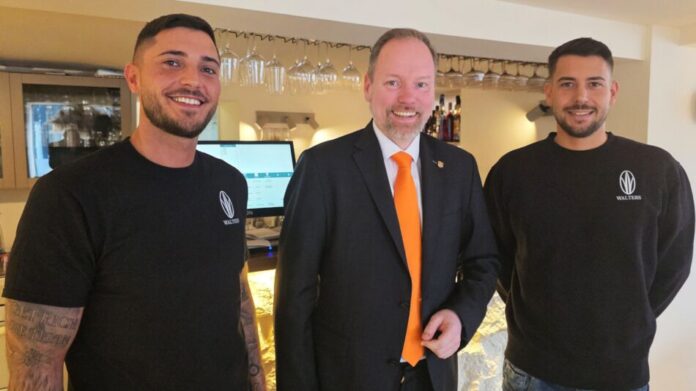 Gut gefüllt war das Café, als Bürgermeister Christian Litzinger zu Besuch kam. „Das läuft ja gut hier”, stellte Litzinger beim Betreten zufrieden fest. Dieses Bild konnten auch die beiden Betreiber des „Walters” bestätigen – die Brüder Julian und Florian Walter, die ihrem gemeinsamen Café ihren Namen gegeben haben. Sie berichteten dem Bürgermeister von der bisher sehr positiven Resonanz der Gäste. Unterschiedliche Altersgruppen kämen zu Besuch, von Schülerinnen und Schülern bis hin zur älteren Generation. Die Stimmung sei durchweg harmonisch.