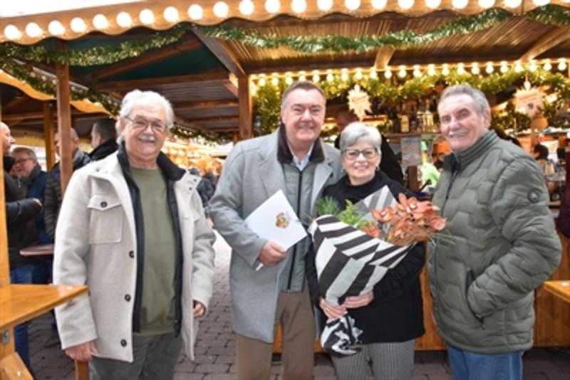 Seine diamantene Hochzeit begeht das Ehepaar Brigitte und Siegfried Eberhardt (rechts im Bild) am Mittwoch, 26. November. Zu 60 gemeinsamen Jahren im Ehestand gratulierte Oberbürgermeister Claus Kaminsky – in Begleitung von Magistratsmitglied Wulf Falkowski – den beiden Hanauer Urgesteinen persönlich. Dafür besuchte er ihren Glühweinstand auf dem Weihnachtsmarkt auf dem Marktplatz – dem Ort, an dem die Familie Eberhardt seit Jahrzehnten fest verwurzelt ist.