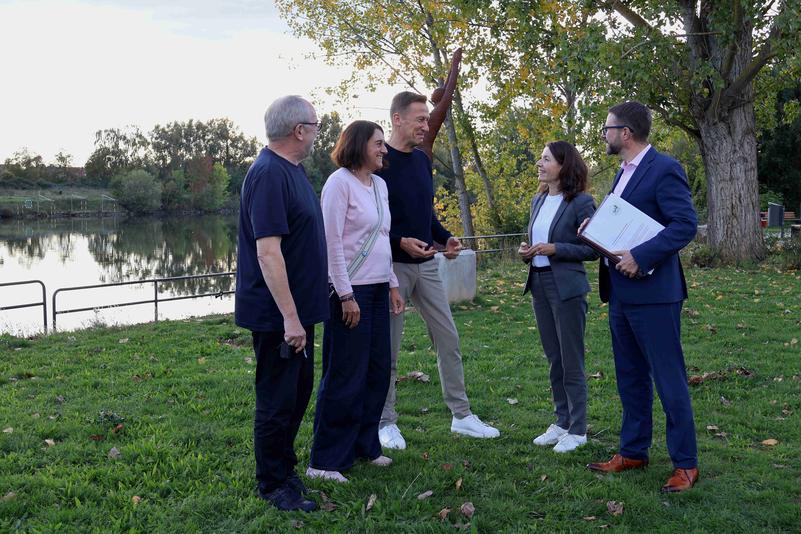 Bildunterschrift: Landrat Thorsten Stolz (rechts) und Bürgermeisterin Monika Böttcher (Zweite von rechts) tauschten sich mit Mitgliedern der Interessengemeinschaft „Das Mainufer den Menschen“ vor Ort an den Mainwiesen über das Thema einer Fußgänger- und Radfahrerbrücke statt einer Autofähre aus (von links): Sprecher Heinz-Josef Mühlmeyer, Ursula Lehr-Wilhelm und Werner Hildebrand.