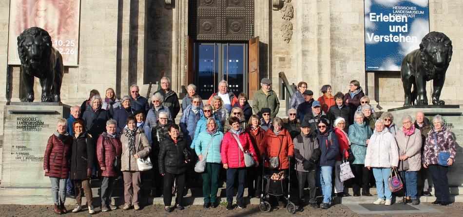 Die Teilnehmerinnen und Teilnehmer aus Rodenbach auf der Eingangstreppe zum Hessischen Landesmuseum in Darmstadt vor der Führung durch die Ausstellungen.