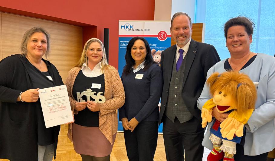 Bildunterschrift: Freuen sich über das KiSS-Siegel für die Sprachförderung (von rechts): Dr. Simone Karau, Sachgebietsleitung Kinder- und Jugendärztlicher Dienst Main-Kinzig-Kreis, Bürgermeister Christian Litzinger, Jane Kolczok, pädagogische Leitung, KiSS-Erzieherin Jennifer Schattat, die bereits vor einigen Monaten ihre Re-Zertifizierung erfolgreich abgeschlossen hat, und Kita-Leitung Sarah Höfker. Foto: Stadt Gelnhausen
