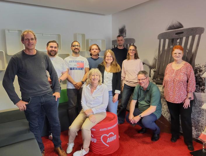 Die Teilnehmer*innen beim Treffen der Verbandsreferenten*innen in den Kreisen vom AWO Bezirksverband Hessen-Süd e.V. mit Ralf Nolte (2.v.r.), Stabsstelle beim Bezirksverband und dem Verbandsreferenten vom Kreisverband Main-Kinzig, Gianni Terribile (3.v.l. stehend).