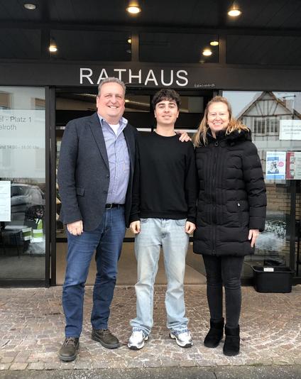 Auf dem Foto: Philip Lösche mit seiner Mutter Sandra sowie Bürgermeister Matthias Pfeifer