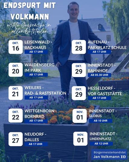 Wächtersbach. Mit einer Reihe persönlicher Begegnungen in allen Stadtteilen geht Bürgermeisterkandidat Jan Volkmann in die heiße Phase des Wahlkampfs. Unter dem Motto „Endspurt mit Volkmann – echte Gespräche in allen Stadtteilen“ lädt er die Bürgerinnen und Bürger in den kommenden Wochen zu offenen Gesprächsrunden ein. Ziel ist es, den direkten Austausch zu suchen – fernab von Wahlplakaten und Podiumsdiskussionen.