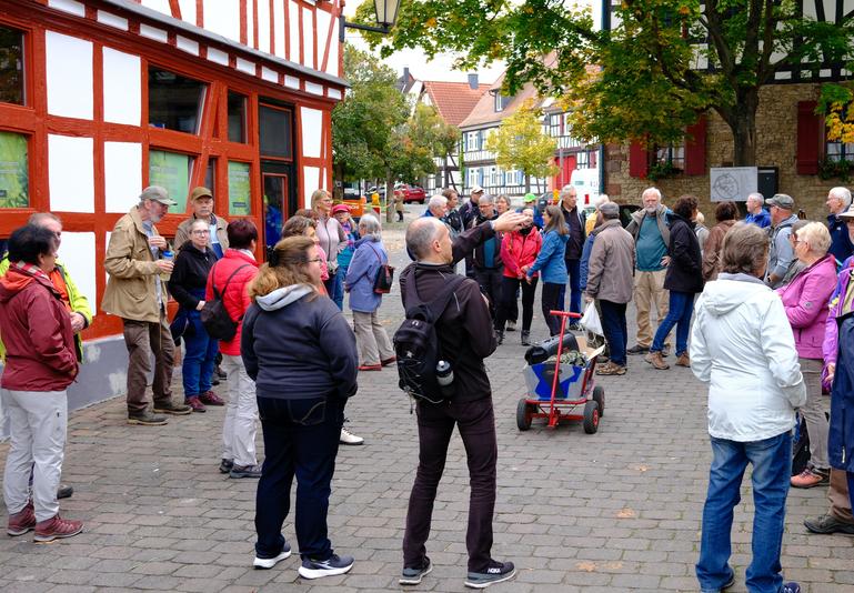 Bild: Matthias Basile (in Schwarz) vom Geschichtsverein stellte im historischen Ortskern die wichtigsten Stationen der Gemeindegeschichte vor.