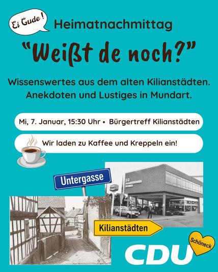 Alte Bilder, Geschichten und ein Augenzwinkern in Mundart: Unter dem Motto „Weißt de noch…? – Wissenswertes und Anekdoten von früher, Geschichten aus dem alten Kilianstädten“ lädt die CDU Schöneck am Mittwoch, 7. Januar, um 15:30 Uhr in den Raum Anould im Bürgertreff Kilianstädten ein. Bei Kaffee und Kreppel blättern wir gemeinsam in der Ortsgeschichte – mit Fotos und Fundstücken und mit Erinnerungen aus der Bevölkerung.