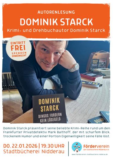 Ein Abend für alle, die Krimis lieben und Literatur gerne live erleben. Am Donnerstag, den 22. Januar 2026 ist der Krimi- und Drehbuchautor Dominik Starck um 19.30 Uhr zu Gast in der Stadtbücherei. Bekannt ist er mittlerweile europaweit als freier Filmjournalist und Fachbuchautos. Im Rahmen der Lesung stellt er Auszüge aus seiner beliebten Krimi-Reihe rund um den Frankfurter Privatdetektiv Mark Balthoff vor.