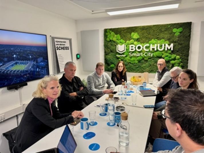 Analoger Austausch zu digitalen Themen: Die Hanauer Delegation um Stadträtin Isabelle Hemsley (4. v. l.) diskutierten unter anderem mit Stadtwerke Bochum Holding GmbH–Chefin Elke Temme (li.).