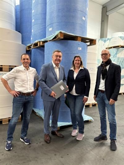 Kaminsky und Kunz erhielten zudem Einblick in die umfassenden Modernisierungsmaßnahmen der vergangenen Jahre. Das Unternehmen investiert nicht nur in seine Produktionskapazitäten – darunter mehrere hochmoderne Schneide- und Falzmaschinen –, sondern auch in Digitalisierung, E-Commerce, künstliche Intelligenz zur Effizienzsteigerung sowie in ein eigenes Fotostudio zur professionellen Produktpräsentation.